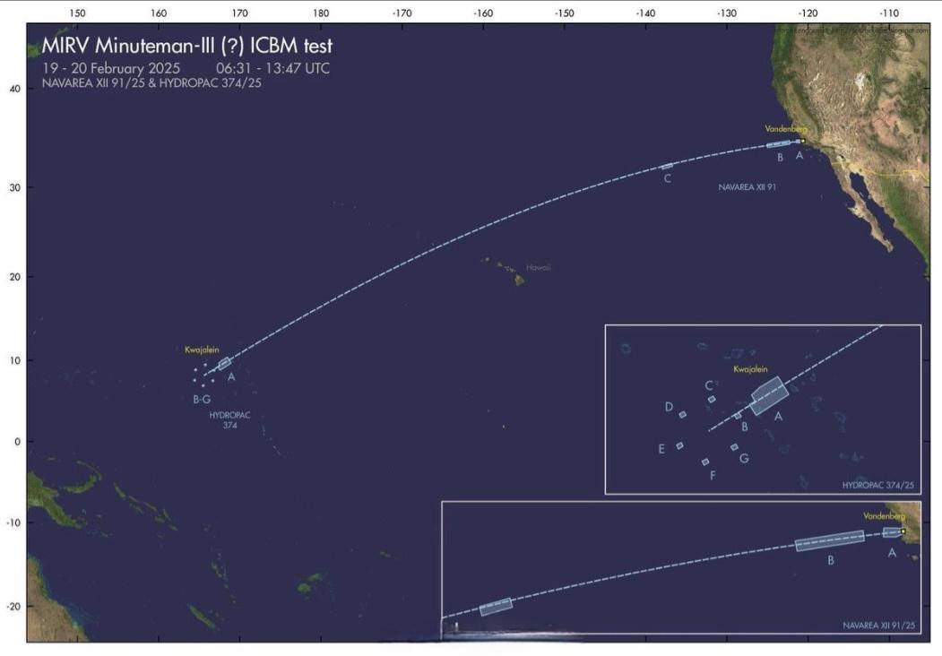 民兵3导弹的试射地点在范登堡空军基地,而模拟打击的目标则是位于南太平洋的夸贾林环礁靶场。